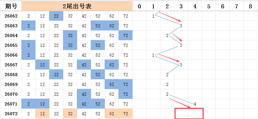 本期看好开出的范围是两码走势至四码走势之间。上期二尾开出四码走势,本期看好上期开出号码12的再次开出,搭配前半部分的号码32共同开出。后半部分的号码,看好两个尾码:号码62和号码72,能够开出其中一码。