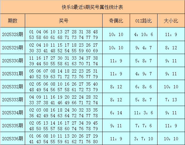 福彩快乐82025336期开出奖号:01 06 08 10 11 13 20 26 27 29 41 43 54 55 59 61 62 71 76 80,其中奖号奇偶比为119,大小比为1010012路比为3710