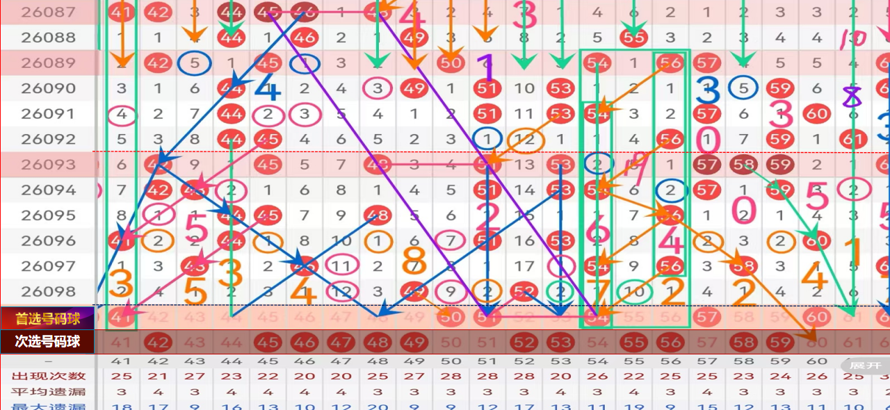 三区间推荐主做号码:41 50 51 54 57 60;防守号码:43 44;