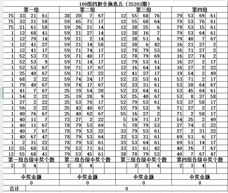 现在统计了近500期数据,组合出来100组四胆全拖进行测试一个月(8月)(每期都是根据我的公式得出的号码,理论100组平均每期出2-3组,因为理论是最好的情况,所以现在测试一个月看看平均每期可以出多少组四胆),100组四胆全拖金额为15200,中一组四胆奖金可以到17260(还有不少两胆(54)和三胆(534))。所以还是比较好的计划,缺点就是成本太高,所以现阶段还是测试,大家挑几注参考就好了,每期都会更新最新的100组四胆全拖。
