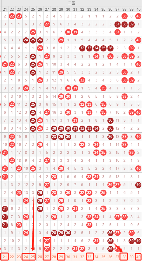 二区:最近二区10期出号情况为:4 4 7 5 5 7 3 7 5 5,总出号情况为53个,平均出号5.3个,本期二区号码还是比较弱势推荐:21 24 25 27 29 33 38 40 。重点关注:21 24 38 40。