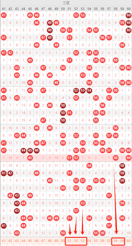 三区:最近三区10期出号情况为:2 5 6 3 4 4 2 8 3 4,总出号情况为40个,平均出号4个,本期三区号码走势比较不错推荐:51 52 53 58 59,重点关注:52 53 58 59。