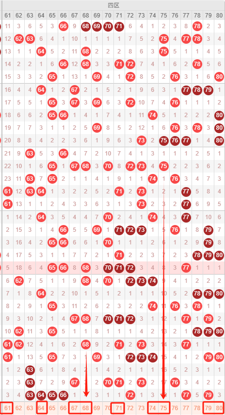 四区:最近四区10期出号情况为:6 4 4 7 5 6 8 1 6 7,总出号情况为54个,平均出号5.4个,本期四区号码推荐:61 64 67 68 71 74 75 79 80。重点关注:61 64 67 68 75。