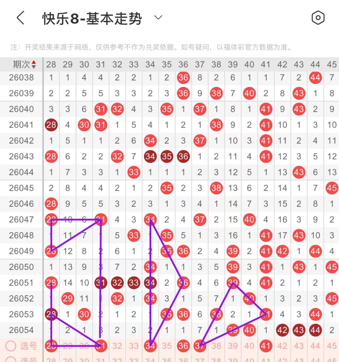 31-40区:本区间上期开出了两个号码,从号码走势图上看,该区现属于热号区,上期只出两个号码,本期注意出号个数有突增的可能,出号个数在三个号码或者以上,有出号走势的号码有31号,隔期相同出号走势,34号,上下对称出号走势,36号,斜连出号走势,37号,双线斜连出号走势。