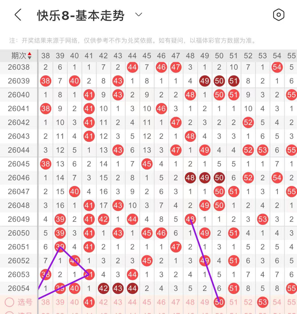 41-50区:本区间上期开出了三个号码,从号码走势图上看,本期可参考的号码走势甚少,在选号上需谨慎,建议以防为主,本期有出号走势的号码有41号,形成一个梅花号走势形态,50号,斜连出号走势。