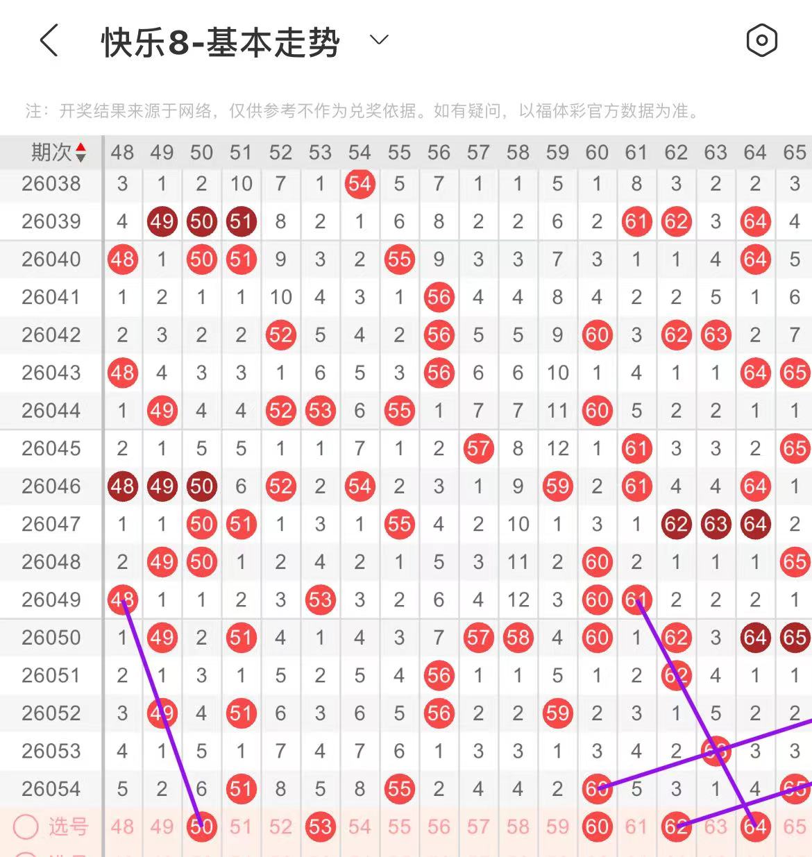 51-60区:本区间上期开出了三个号码,从号码走势图上看,该区断区后回补了三个号码,本期继续关注该区号码持续回补,出号个数在两个号码左右,有出号走势的号码有60号,走重,防53.60同出。