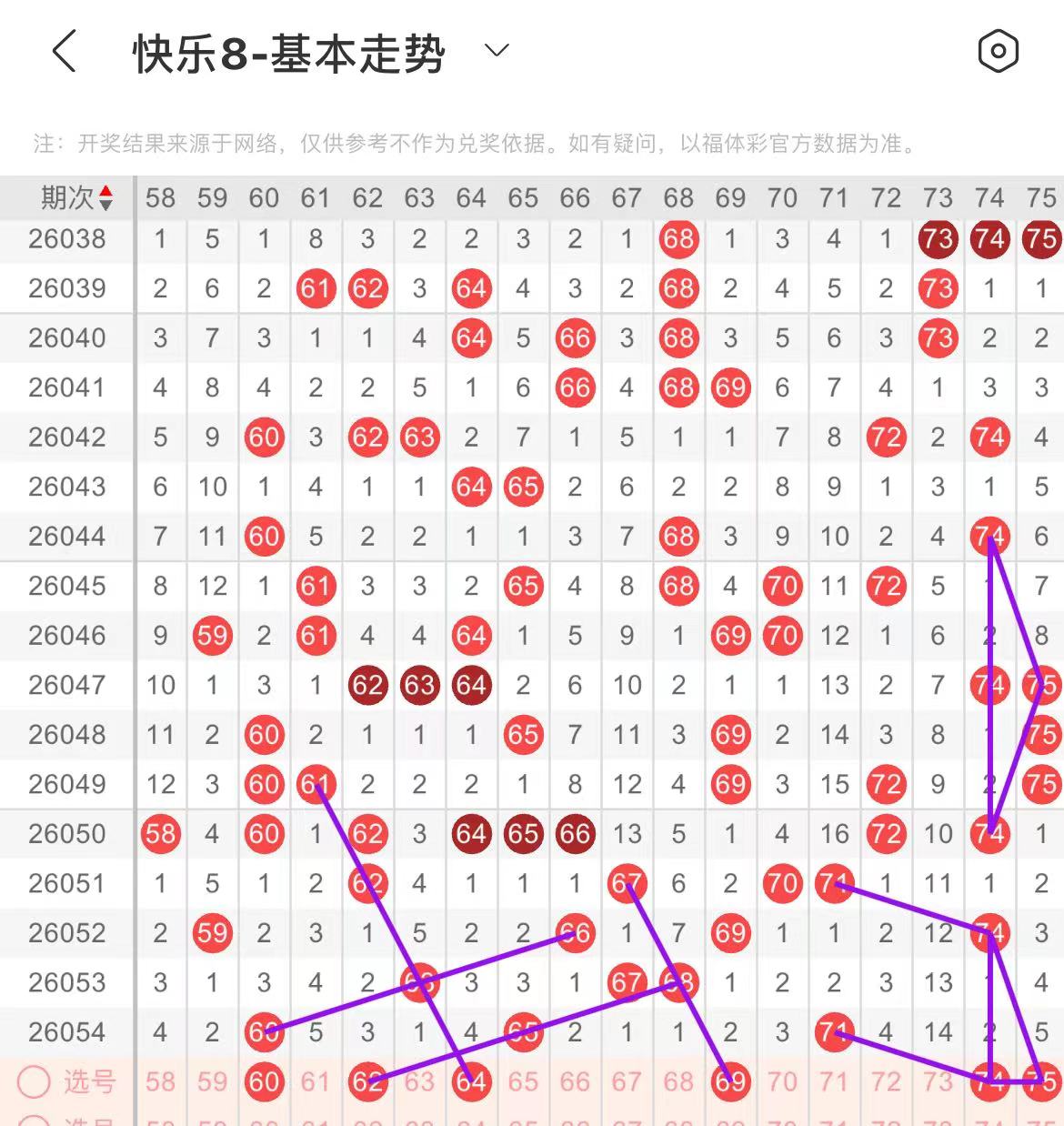 61-70区:本区间上期开出了一个号码,从号码走势图上看,该区现属于温号区,本期出号个数应该有所增加,有出号走势的号码有62号,平行斜连出号走势,64号,隔期四斜连出号走势,69号,71对应69出号走势且有斜连。