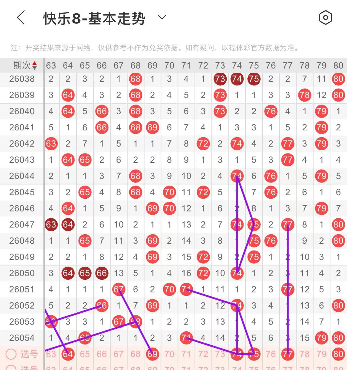 71-80区:本区间上期开出了三个号码,从号码走势图上看,该区连续走冷后,本期注意出号个数有所反弹,出号个数在三个号码左右,有出号走势的号码有74.75号,形成一个三角走势形态,77号,隔期相同出号走势,防77.80同出。