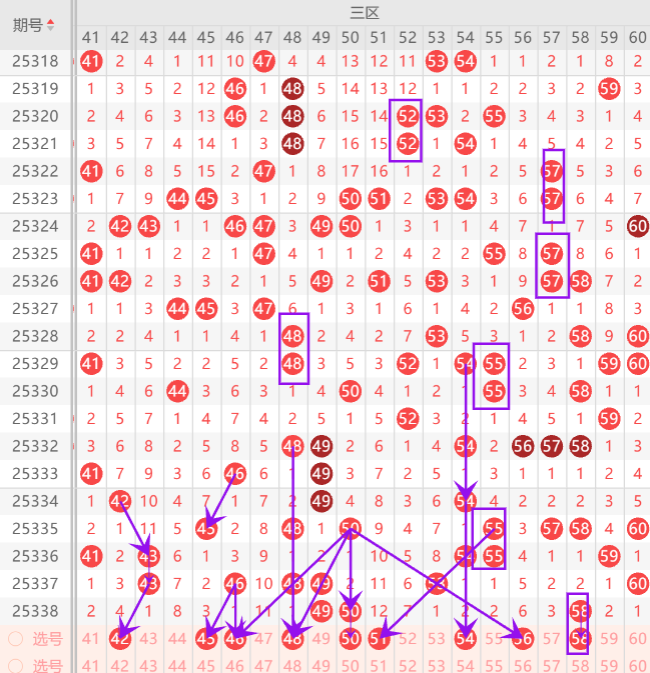 而三区的打底号是41.44.42.45.48.50.53.54.56.58.中参考3-4码开出机会,
