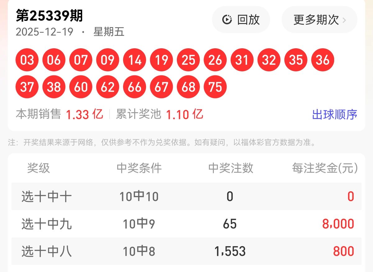 上期福彩快乐8第 2025339期开奖号码为【03 06 07 09 14 19 25 26 31 32 35 36 37 38 60 62 66 67 68 75】,其中大小比为6:14,奇偶比为10:10,和值为716,跨度72,四区间比为6:8:1:5。下面是对本期对于每个号码的详细分析。