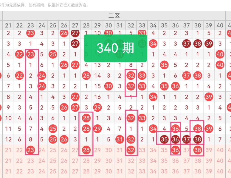 上期本区开出8枚号码,是四区中的热区,号码集中在22-39区间。本期遵循“热区降温、温号发力”的思路。23位于本区前端,上期25、26开出后,23作为相邻号码有衔接出号的可能;28是偶数温号,上期31、32开出,28可填补中间空缺,形成小范围的号码衔接。32是30-35区间的补充号码,上期32、35开出,32能平衡中段分布;36和38属于后段偶数,上期四连号35、36、37、38开出后,这两个号码可完善后段布局,且两者间隔合理,覆盖23-38全区间。