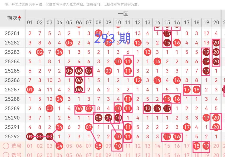 01-20区间,上期开出7个号码(01 02 03 10 11 15 16),结合近10期数据来看,该区间出号量始终保持高位,平均每期开出6个号码,活跃度显著高于其他区间。重点关注号码:10、18、08。10号在近10期内多次出现,25284期、25280期、25278期等多期均有开出,且25292期再度现身,走势极为稳定。18号在25278期、25274期有出号记录,近期在15-18连号区间的带动下,出号概率大幅提升。08号作为前区经典热号,25281期、25290期均有亮相,适配本区间连号高频出现的特点,可重点追踪。备用号码:04、19。04号在25288期、25291期出现,适配区间内奇偶平衡走势;19号则在25283-25285期、25290期开出,能有效覆盖尾数9的出号空缺 。因此综合推荐该区间号码【04 08 10 18 19】