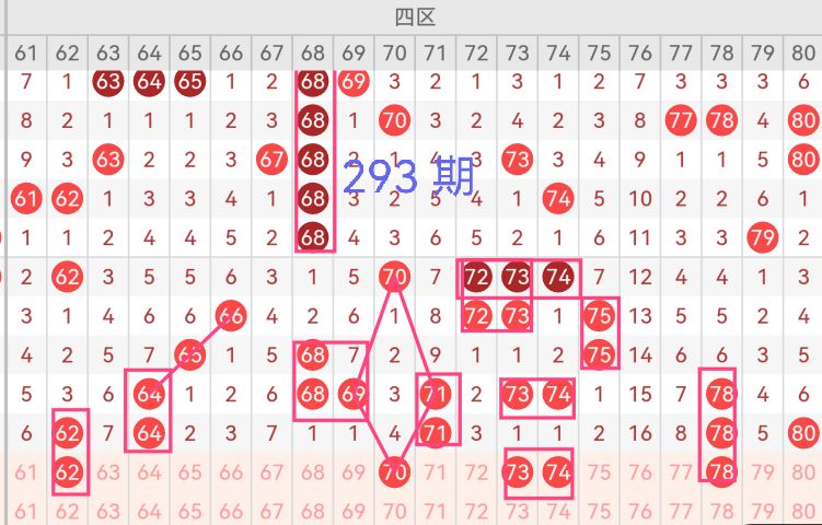 61-80区间上期开出5个号码(62 64 71 78 80),出号量处于正常水平,本期存在增量空间。68-72区间为连号高发区,25284期、25280期均在此形成连号组合,且后区整体有回补预期。重点关注号码:70、73、74。70号在25288期、25284期,属于回暖热号,适配68-72连号区间的走势特点。73号在25291期、25288-25289期开出,是后区的核心稳定号码;74号则在25291期、25288期、25286期亮相,与73号形成常见搭配组合。备用号码:62、78。62号在25292期、25288期、25286期出现,延续了自身高频出号的特质;78号在25292期、25291期开出,适配后区尾数8的出号周期。因此综合推荐该区间号码【62 70 73 74 78】