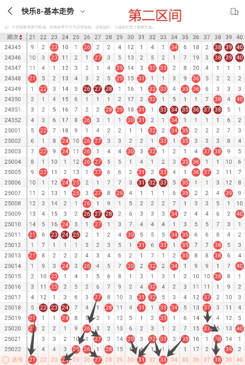 第二:需要重点本区间奇数偶数搭配的号码,需要重点关注21 24 27 31 33 38这些号码会出现5-7个。