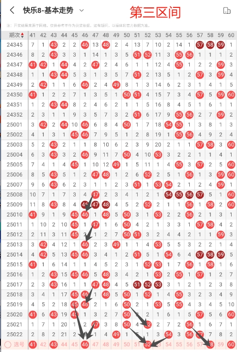第三:45-60这个小区间需要重点关注会出现多个号码,防范等间距遗漏的号码,关注冷号会开出,重点关注区间联动号码。