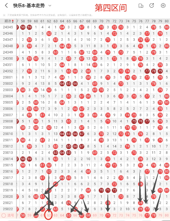 第一:根据整体走势来看本期第4区间热度应该会有所上升,可以把重点放在65-80这个小区间进行选号需要重点关注62 65 67 68 71 77 78这些号码。