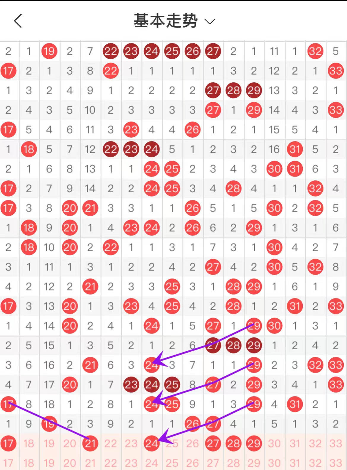 21-30区:本区间上期开出了两个号码,从号码走势图上看,该区现属于热号区,上期出号减少是为本期提供了很好的走势,前半区走空,本期21号,斜连出号走势,24号,27对应24出号可能,而后半区,号码走向向区尾延伸,27.28.29号,有可能做为收尾号开出。