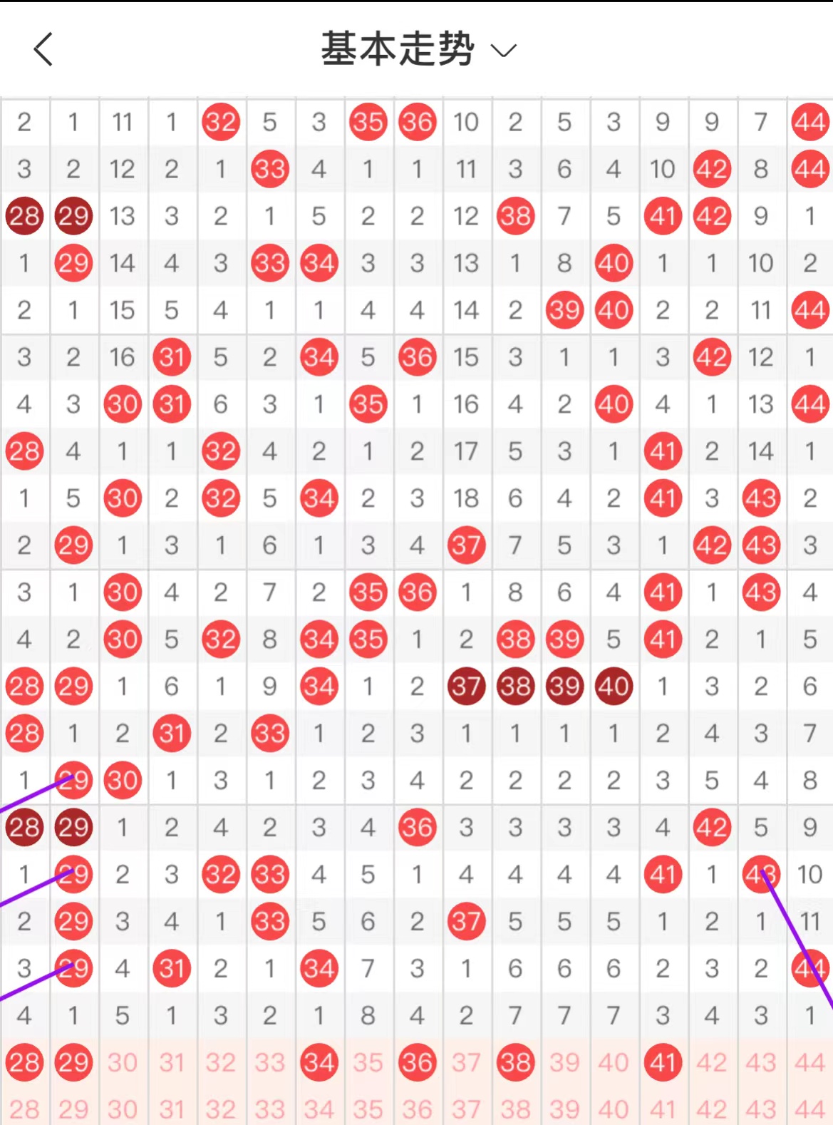 31-40区:本区间上期断区了,从号码走势图上看,该区现属于冷号区,在选号上过多的是以防为主,本期34.36.38做为回补号码防范。