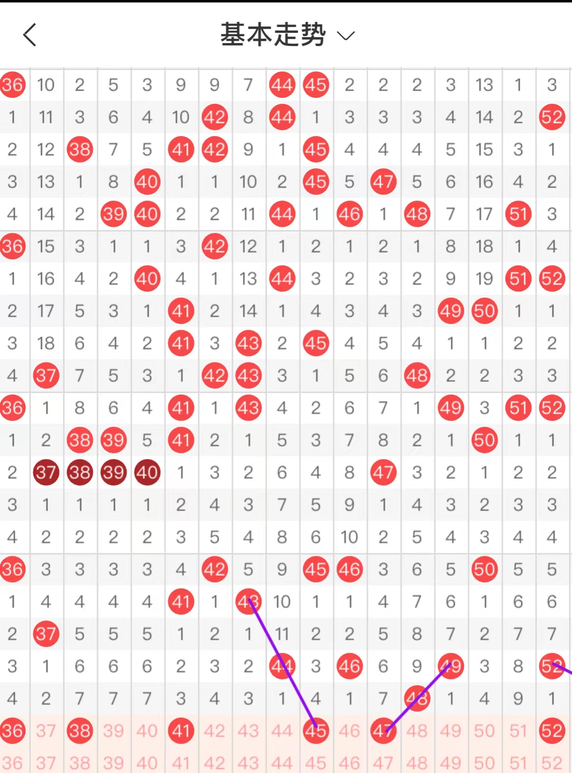 41-50区:本区间上期开出只出了一个号码,从号码走势图上看,该区现属于冷号区,不过,还算有号码走势可参考。本期有出号走势的号码有41号,做为前半区号码回补防范,45.47号,斜连出号走势。