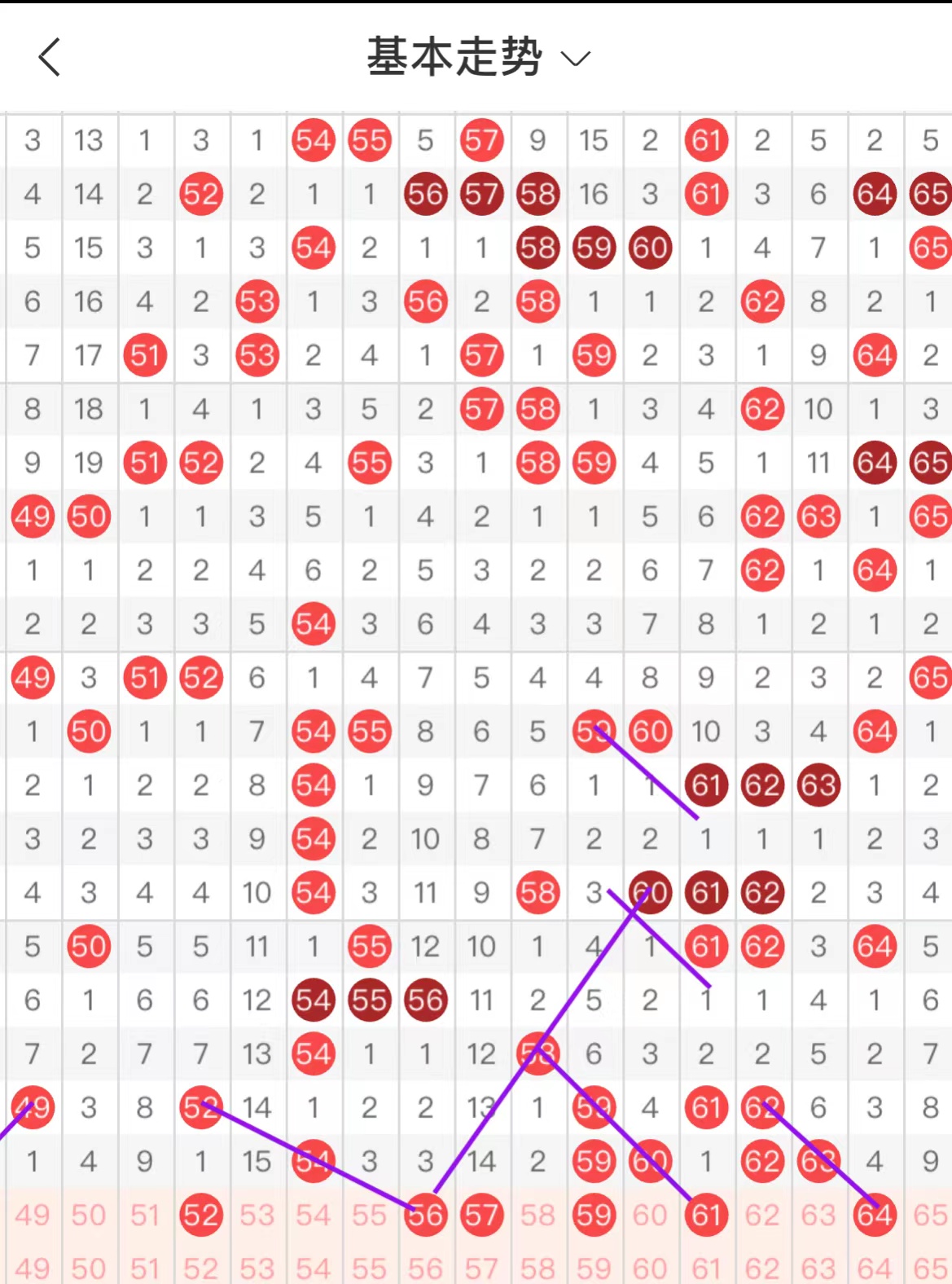 51-60区:本区间上期开出了三个号码,从号码走势图上看,该区在努力回补号码,在转入温热区做准备。本期有出号走势的号码有52号,54对应52出号可能,56.57号,斜连出号走势,59号,斜连出号走势,这里形成一个“卜”字走势形态。