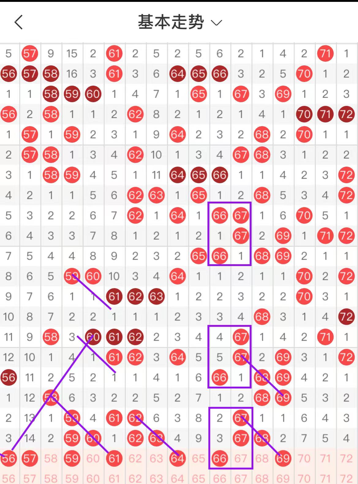 61-70区:本区间上期开出了四个号码,从号码走势图上看,该区有暂时性走热,可顺势再抓一期。本期有出号走势的号码有61号,60对应61出号走势,64号,斜连出号走势,66号,跟上面走势形态相同,69号,斜连出号走势。