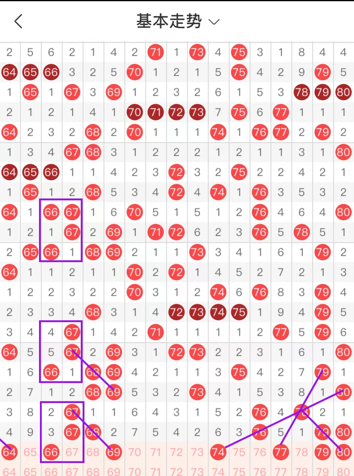 71-80区:本区间上期开出了三个号码,从号码走势图上看,号码向区尾聚拢。本期着重关注后半区号码回补。本期有出号走势的号码有74.77号,斜连出号走势,79.80号,防走重的可能。