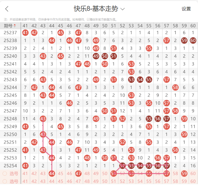 今日五区号码建议参考44的隔期号码的形态开出,注意43 44的阶梯对称的号码开出。五区后区号码建议参考44 47的关联形态号码开出。今日六区号码建议参考连号下方开出座号的形态,此位置建议参考55 57的位置开出座号,此位置需要尤其注意座号形态的开出。六区后区号码今日建议参考59的座号下方带下斜连号的走势。