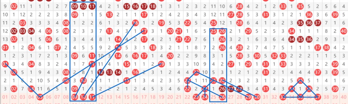 【第一区间1-40】上期开出12个号码。本期分析推荐:05-09-10-11-23-24-26-29-30-33-35-37十二个号码。05同路五期和准斜连五期号码;09-10-11上下对称,且各有斜连出号走势;23斜连号码,24为34交替出号形态,同时23-24为上下对子对称;26偶数三斜连,上下对称三重号码,并且近期26和62(同出概率较大)形成如影随形出号态势;29-30主要看好阶梯对子出号走势,二者均有斜连走势,在这种情形下就形成23-26-29同路完整形态走势;33-35-37为很完整的金字塔形态。区间推荐重点号码:一小区间09-10-11,二小区间23-26-29-33-35-37。