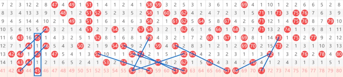 【第二区间41-80】:上期开出8个号码。本期推荐:43-45-56-58-61-62-67-68-71九个号码。43三重和四斜连,和遗漏等距号码45共同组成近期常见梅花形态;56斜连三期、同路三期号码,58同路三期,二者又形成了菱形出号形态;61奇数斜连四期,62(和26同出概率较大)同路三期,61-62在此形成上下对子对称形态;67-68为中间对子,这种出号形态也较为常见,且67奇数四期走势,68同路、偶数斜连走势;71为奇数三斜连、和1尾斜连走势。区间推荐重点号码:三小区间56-58,四小区间62-67-68。