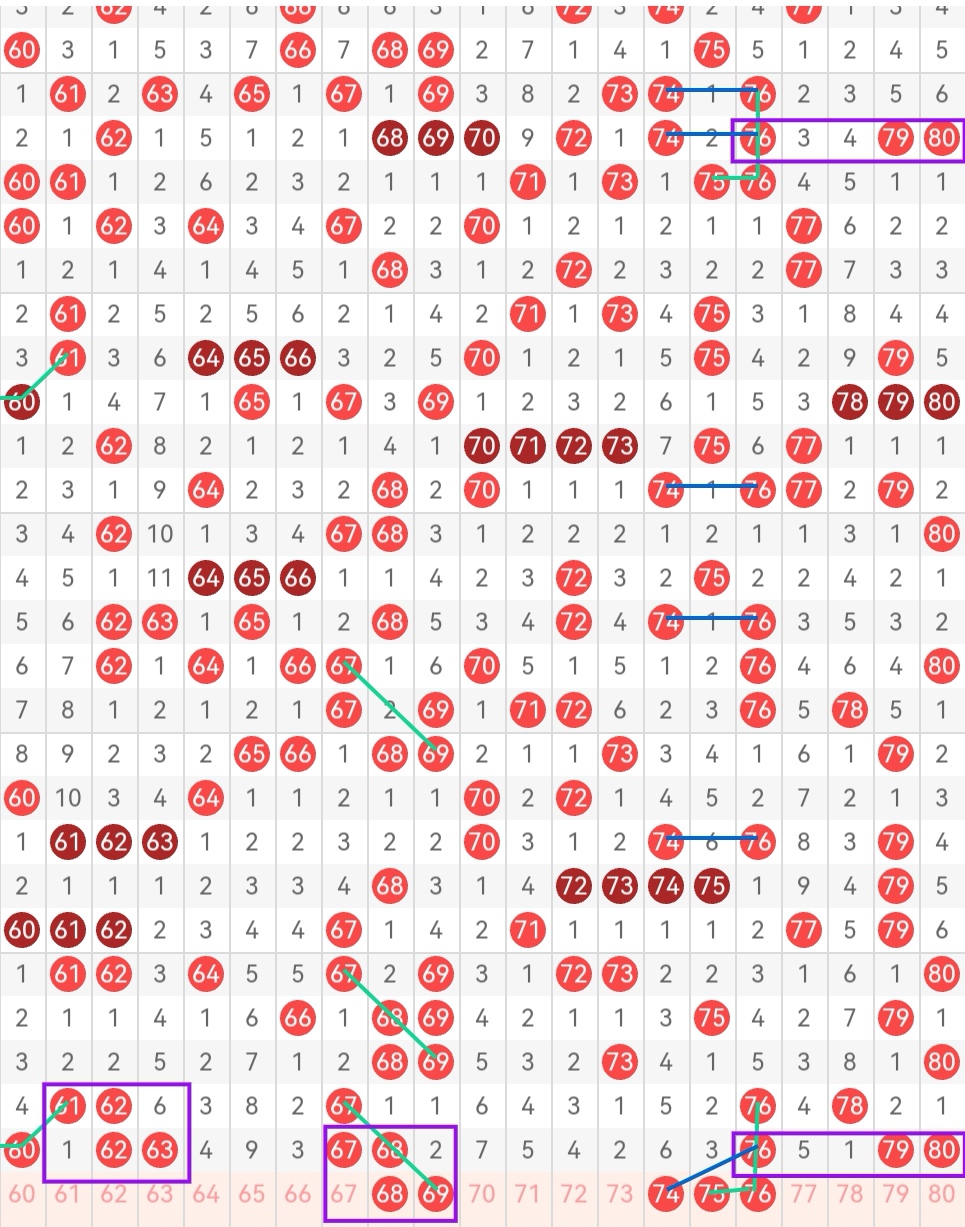 下面我们进行第四区间的号码走势研判。第四区间我们看好69作为三斜连开出;同时看好68和69同出,即是上一期62、63的走势;然后我们看好74作为76的联动回补号码开出;75、76两码在往期中也有相同的走势,在此我们可以防守一下。