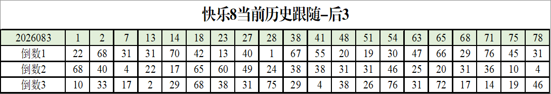 我感觉选热的同时,还要注意防冷条件开出,可以直接选取每个号码跟随出次前三的号码,也可以考虑把出次最后的三个数字加进去,不过这样可能号码太多,可以尝试。图上也能看出单独号码跟随的情况,我就不一一统计每个号码的出次了,我这里考虑提高概率,取每个号码历史跟随的前三号码和后三号码,根据2026083期的号码,我关注正数3和倒数3的号码号码为: