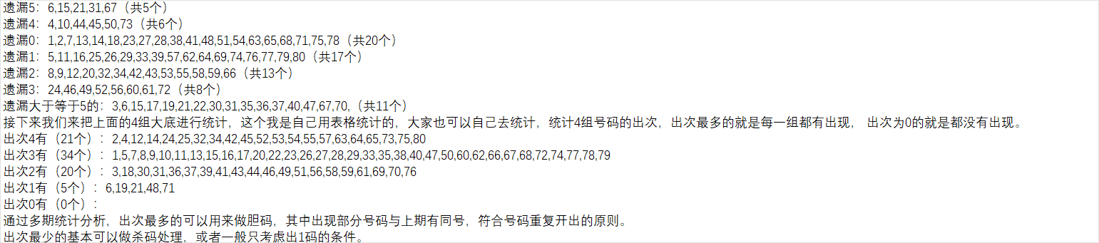 我的基本思路是通过号码尾数情况,取出6尾相关的号码作为第一组大底,然后统计号码跟随的情况分析出第二组大底,通过短期遗漏分析形成第三组大底,再按照对数补数分析统计出第四组大底(根据情况可能实时增加其他大底 ),最后把这些大底进行统计,重点关注出次最多的号码,搭配出次少的号码,灵活组号,形成本期精选胆码。