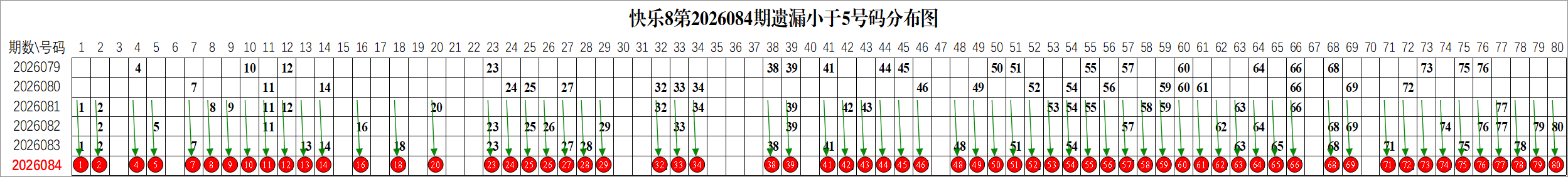 所以这个条件值得关注,从号码分布图上我们可以分析出,遗漏小于5期的号码有: