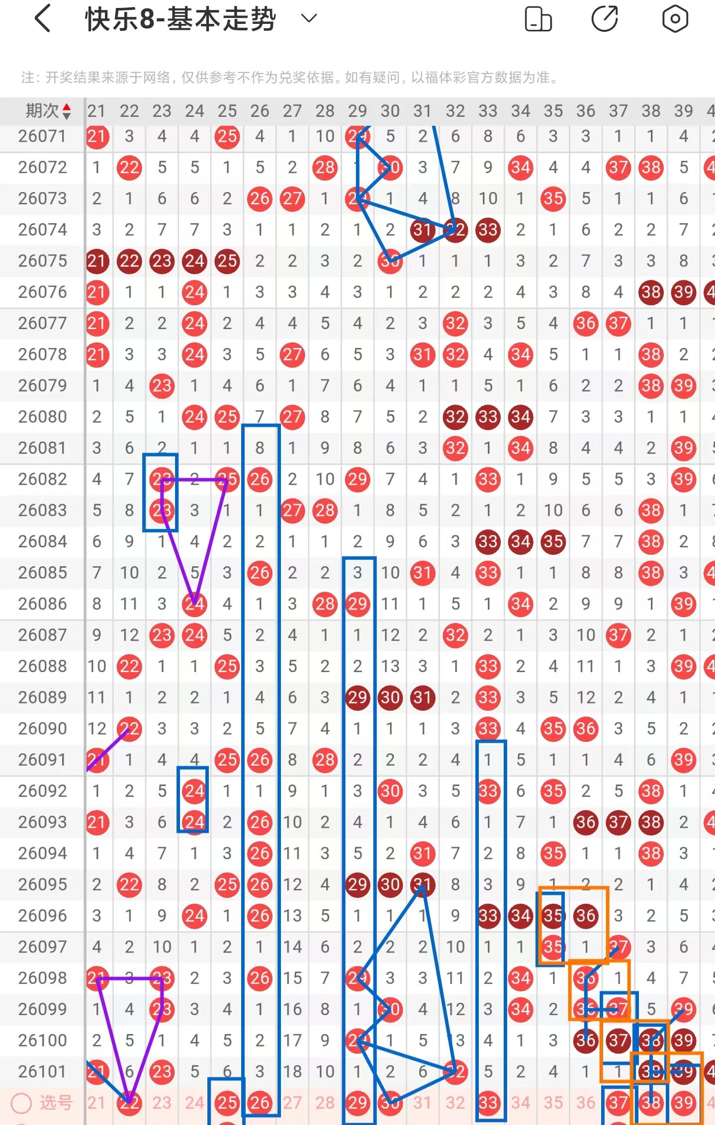 二区间稳定落号,一共开出六个号码球,本期考虑等同数量的号码球,注意近期13、14、15、16号码球的走势与14、15、16、17号码球的走势相似,本期注意22号码球,注意斜连走势回补的22号码球,同时也是近期相似形态号码球,阶梯落位重码走势注意25、37、39号码球,注意期数和值加减法的26、29号码球,注意隔期对称回补的30号码球,近期29、30、31、32号码球的走势相似,本期注意30号码球,注意隔期递增的33号码球,两码同落下期回补一码的走势,注意38、39号码球重落一码,以35号码球为对称走势起点,注意走势形态的38号码球,同时也是近期相似形态号码球,因此二区间关注22-26-30-33-38,注意本区间的选二复式22-26-30。