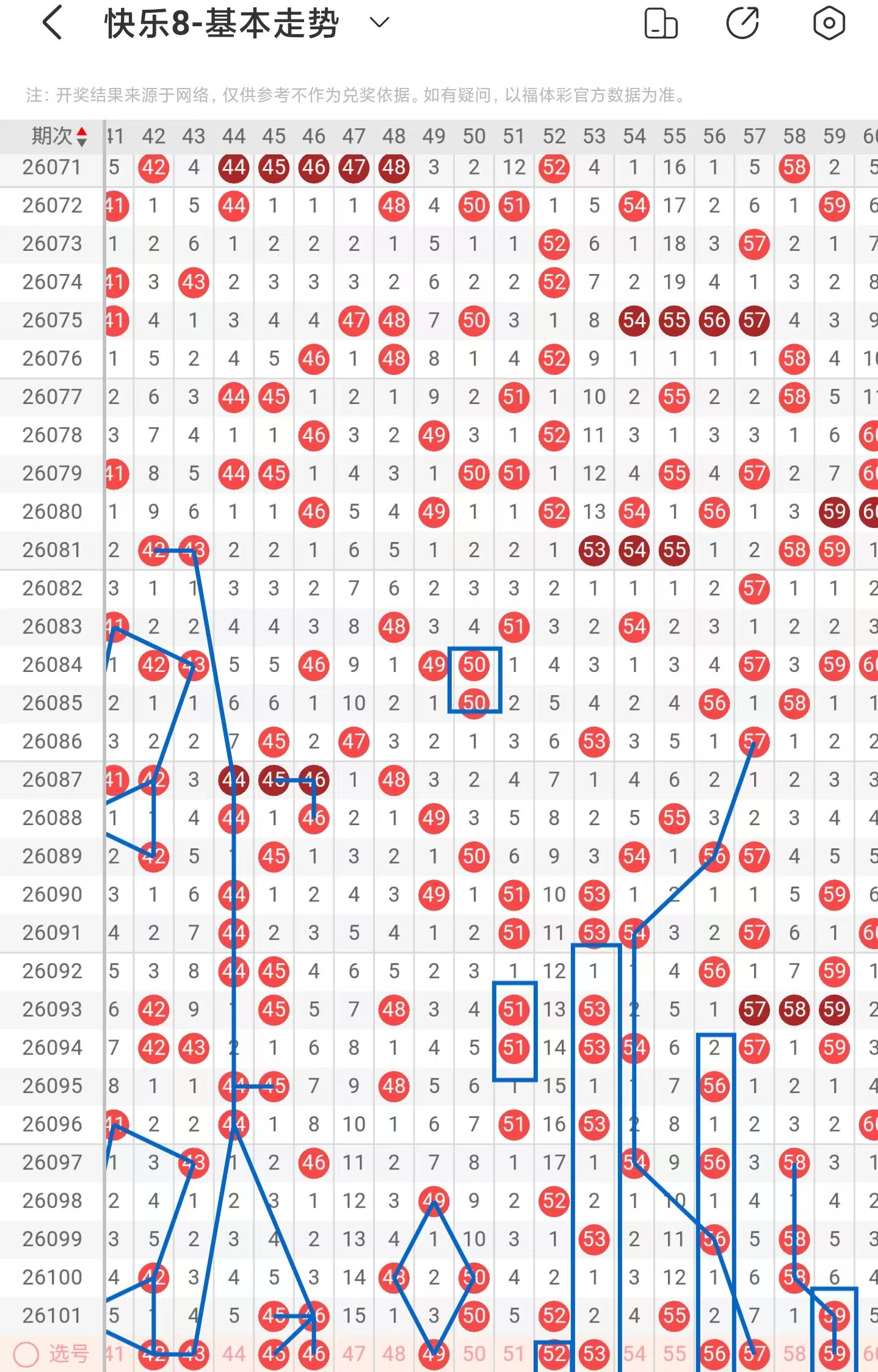 三区间上期小面积增加落号,一共开出六个号码球,本期考虑减少号码球的数量,注意近期40、41、42、43号码球的走势相似,本期注意42号码球,以35号码球为对称走势起点,注意走势形态的42、43号码球,注意百期相似形态的45号码球,注意近期45、46号码球同期下落,下期回补46号码球,防守菱形形态的49号码球,阶梯落位重码走势注意52、59号码球,注意隔期对称回补的53号码球,阶梯落位连码走势注意55、56号码球,以54号码球为对称走势起点,注意走势形态的57号码球,近期55、59号码球同期下落,下期回补57号码球,注意百期内59、61号码球同期下落,下期回补59号码球,同时也是近期相似形态号码球,因此三区间关注42-43-46-57-59,注意本区间的选二复式42-57-59。