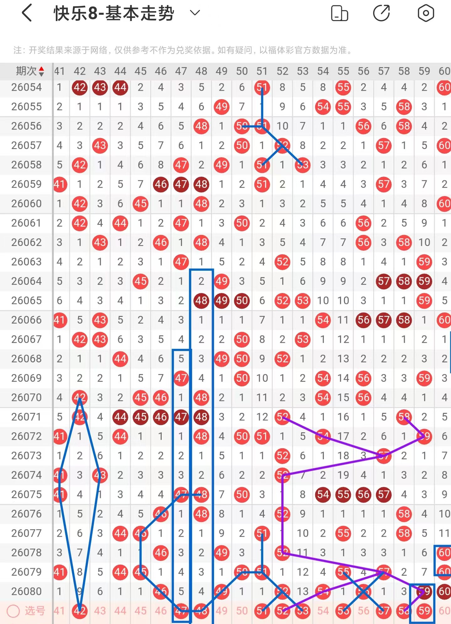三区间上期稳定落号,一共开出七个号码球,本期考虑减少号码球的数量,注意百期相似形态的42号码球,注意百期相似形态的47号码球,同时也是隔期递增号码球,注意隔期对称回补的48号码球,注意近期50、51、52、53号码球的走势相似,本期注意51、53号码球,以52号码球为对称走势起点,注意走势形态的52、58号码球,以56号码球为交叉中心点,注意分边落号的55、57号码球,同时57号码球也是百期相似形态号码球,阶梯落位重码走势注意59号码球,因此三区间关注42-47-48-52-58,注意本区间的选二复式47-48-58。