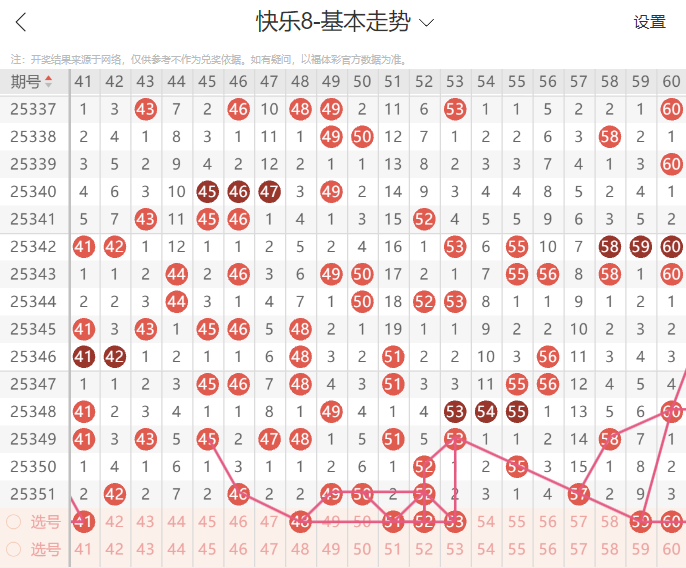 今日五区号码建议参考42的分边号码41开出,后区号码注意顺下形态的分边号码48开出。今日六区号码建议参考51的夹空号码以及52的三重号走势开出。同时注意53的重号复隔的走势开出。今日六区号码建议参考59的九期遗漏号码以及60的一二三四的号码走势。今日五区六区推荐号码:48 51 52 53 59 60.