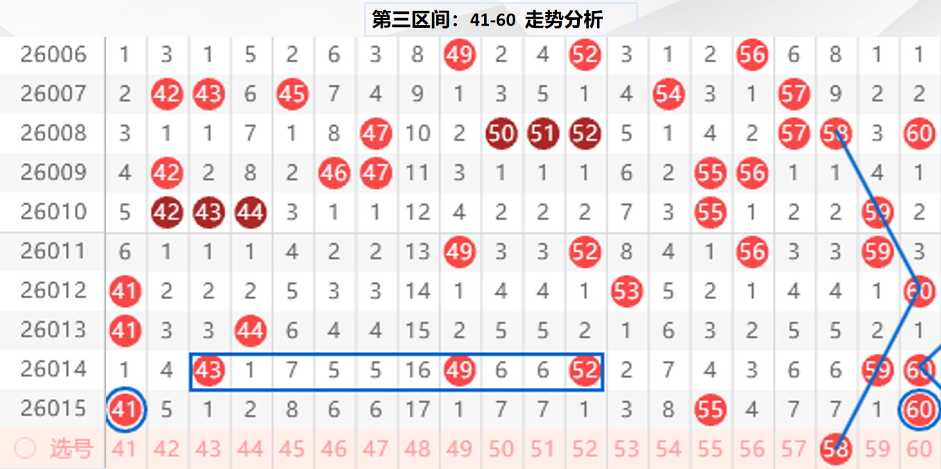 三区分析:【41-60】(走势图标注号码非小黄车大底,请谨慎参考,具体思路将在直播间分享讨论)