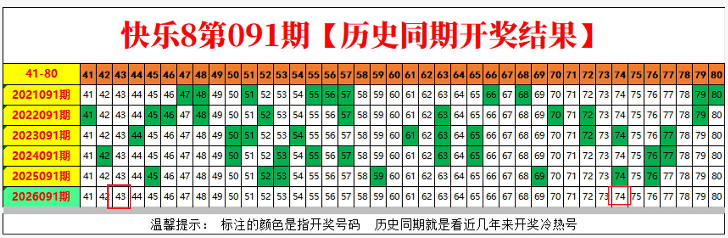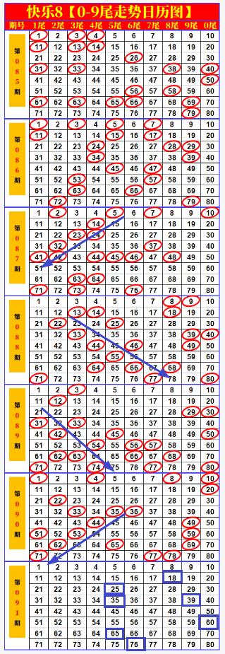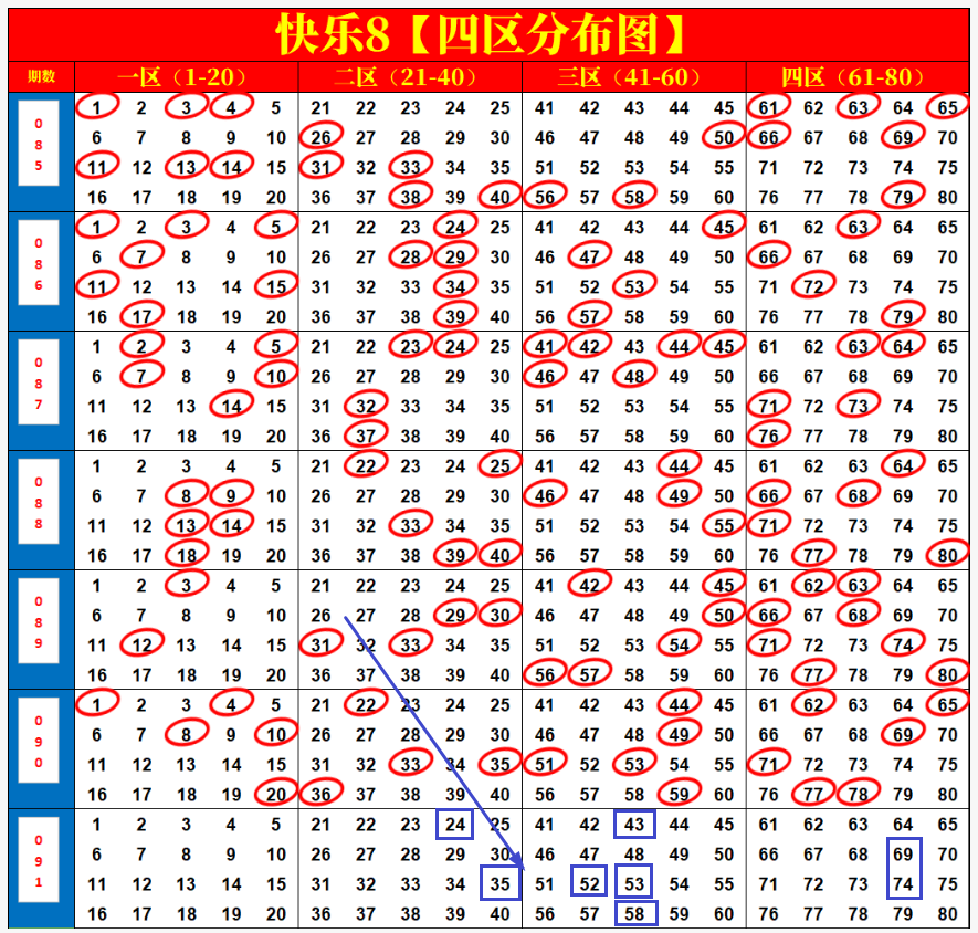 快乐8第26091期尾号、四分区走势分析,上期选五8码中5,6码中4,再次拿下!