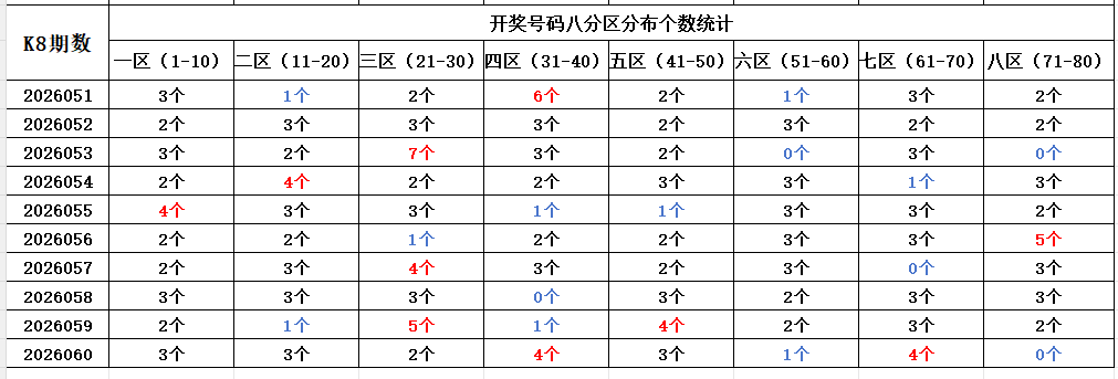 首先看上期回顾,“快乐8”第26060期开奖结果:2.3.4.14.15.19.25.28.32.38.39.40.42.45.48.60.61.63.65.67;通过分析开奖号码,分享第一个数据分析:统计开奖号码的八分区冷热走势,判断出号规律。以近10期开奖号码的八分区统计数据为例: