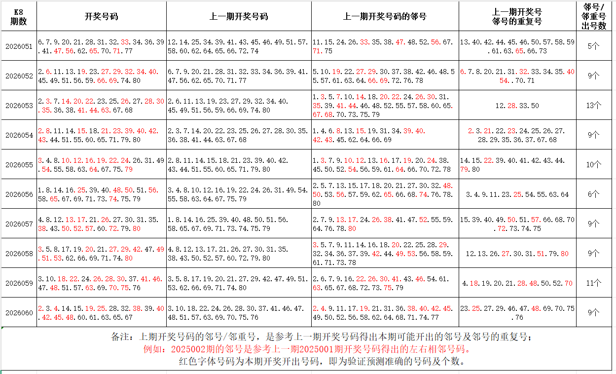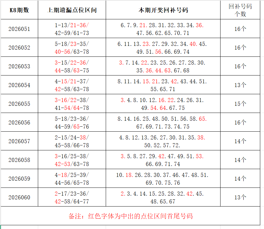 如图,上期的遗漏号码在下期开出10个左右,即为回补号码。定准点位区间首尾号码是关键!以上期2026060期为例,定位4个遗漏区间,围中13码!结合上期开奖号码,以跨度值大于或等于7为依据,本期关注3个遗漏区间:4-14/48-60/67-80;重点关注遗漏区间:5-18/24-39/41-58/62-76。点位区间号码和大底号码请勿混淆,个人分析,仅供参考。
