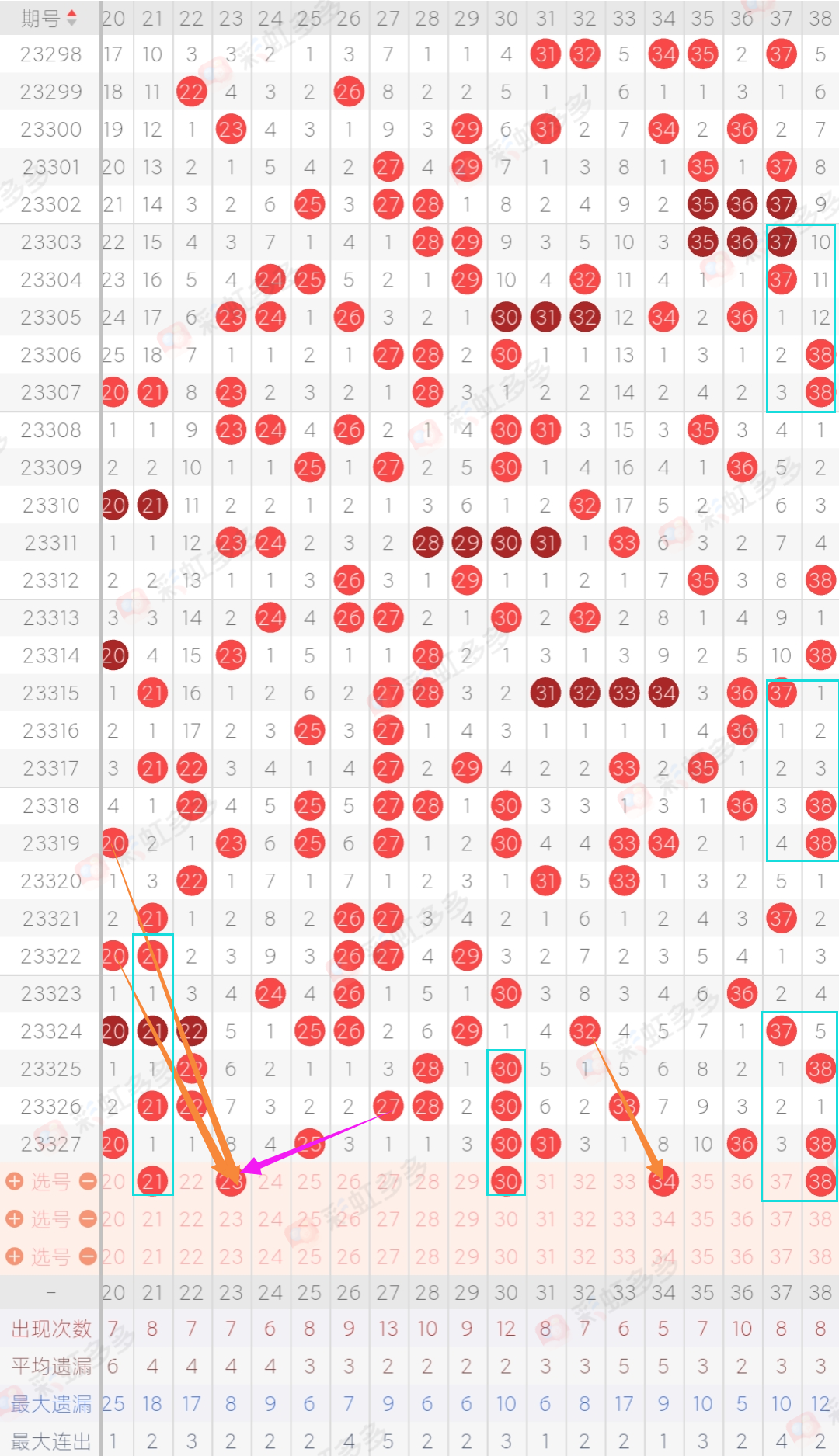 接下来入场的是第二区间,昨天第二区间不负众望也是出现了七个号码球,可以说是大获全胜,今天号码走势也是比较明朗的。首当其冲的21号码球开始冷转热,也是一个跳空隔一的走势,可以做拖,做胆不太建议。30是近期热码第二名,也是四连重号,胆大可以做胆,38号码球则是简单重号备选号码。23为四斜连走势,稍微注意一下还有一个超长斜连走势,也是可以作为第二区间主胆尝试。