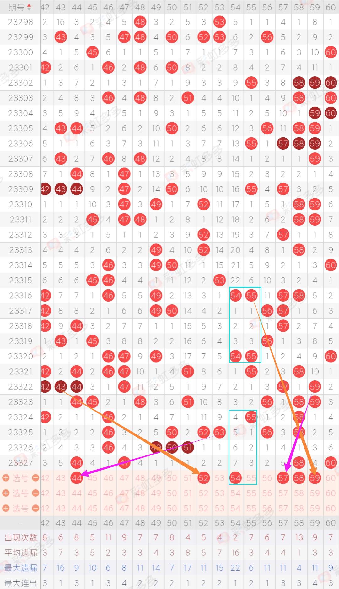 第三区间,上期出现五个号码球。值得注意的是上期成功开出来三角杀,以及0个重号,所以本期重号三区间也是要出现的,首先作为三区间最热两个号码的46号码球与58号码球,昨天46重号断了,今天58重号概率大概率要来,其次是斜落号码球57号与夹号59号所形成的三连号可以防守一波。至于54号则是简单的隔几期出一期,且符合斜落走势。为什么不说四开头的号码球呢,因为个人认为这么多期热了,可能会断区。防守可以做44的重号,其余的走势也还可以,就不一一分析了。