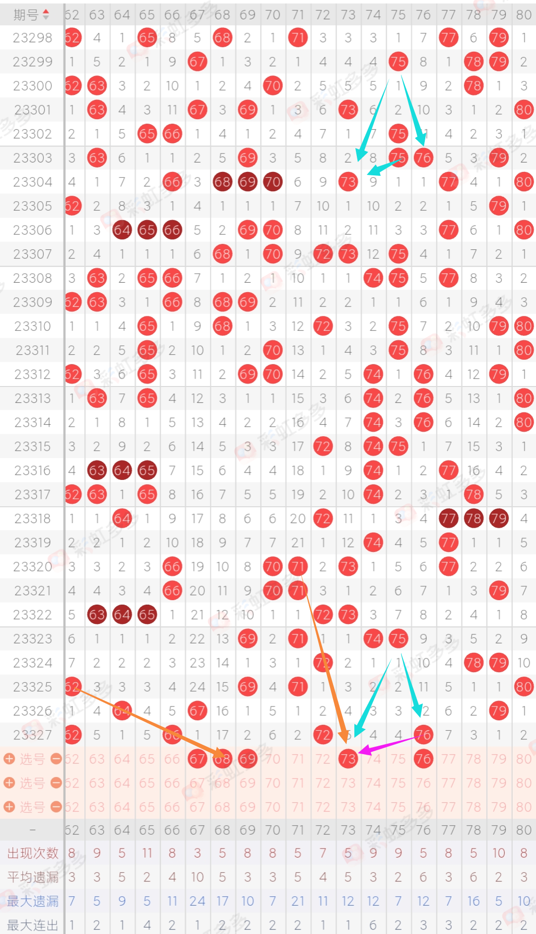 最后隆重登场的是第四区间,为什么说是隆重登场,因为这个区间有本期唯一一个定胆——73号码球!为什么说73号码球作为本期定胆呢,首先第四区间上期只出现了四个号码球,属于偏少区间,其次也是最主要的一点,四个号码球全部都是偶数,故本期第四区间号码球主攻奇数。73号码球符合斜落走势,斜连走势,可做定胆。重号推荐66/76二选一,防守可以做68,四斜落且为遗漏号码,主胆看个人意愿。最后建议防守号码球为71号。