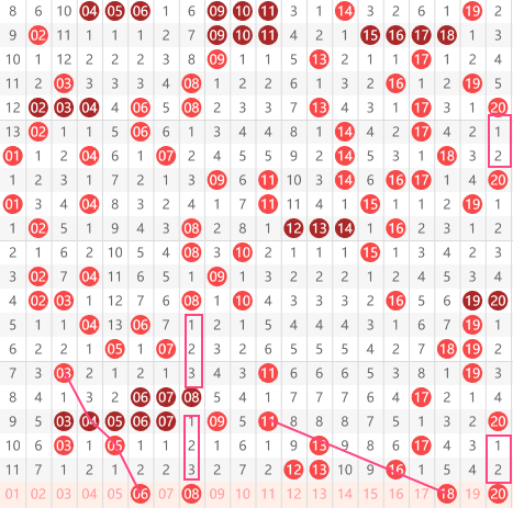 快乐8第2026041期01-20区域,推荐的第一个号码06号,大家可以看到03间隔一期给出了04,斜着开出了05,然后再斜着一期给出06的走势,而且06又是一个上下间隔2对称的走势。然后就是08号间隔3的对称走势,同时06和08又形成了一个三角形的走势。后面就是18号,我们看到11间隔一期给出13,然后再间隔两期给出16,再间隔两期给出18的对称走势;下来就是20号的间隔对称走势。