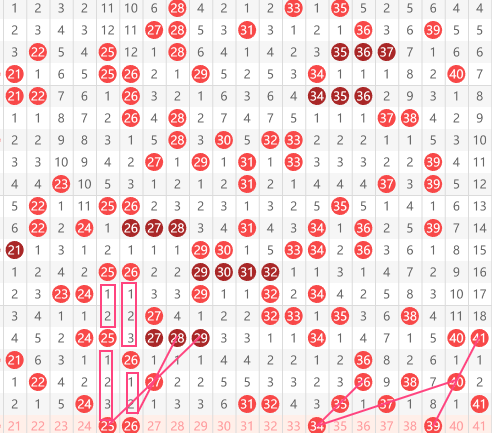 快乐8第2026041期20~40区域,二区推荐的第一个号码是25号和26号,大家看到它两个的走势是完全对称的,上面是25.26,间隔两期出了个25,然后间隔3期出了个26,那么下面这个25.26可能会同时给出,同时我们看29间隔一起给出27。然后间隔一起给出25,然后29~26的间隔一斜连。下来就是34号。一个三斜连,一个间隔二斜连,以及39号。