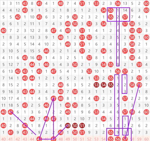 快乐8第2026041期41-60区域推荐的第一个号码是45号,大家看到41间隔一期开出43,然后再间隔一期给出45的走势,而且45我们看到从47到45的间隔一斜连。第二个号码是 47,本身是一个间隔2的对称走势,它和45形成了一个三角形的走势,如图所示。然后就是55~57这三个号码。我们看方框标注上面是两个55带一个57,下面两个55可能也会带一个57,而且57又是一间隔对称,还有一个59~57的间隔,三斜连56又是一个间隔9的对称走势,所以这三个码很有可能同时开出。