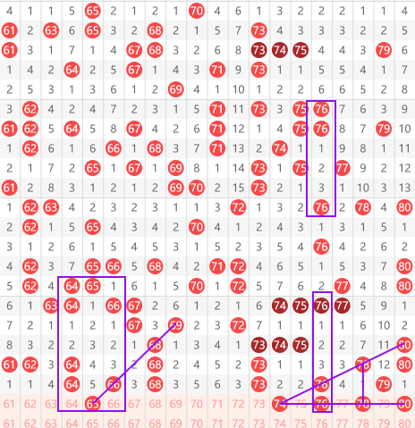 快乐8第2026041期61-80区域的推荐第一个号码65号,大家看方框所示,上面是两个64带个66,中间加个65,下面同样的走势,然后69开出68,间隔一给出66带出65的走势。然后就是后面的74、76、78和80这四个号码。首先看74号,它是一个80~74的间隔,14歇连。然后就是76号,如方框所示上面都是间隔3,然后带个两重,下面走势完全相同。然后。78号考虑从80.79到78的一个。斜脸走势,然后80.78.76.74又形成了一个三角形的走势。