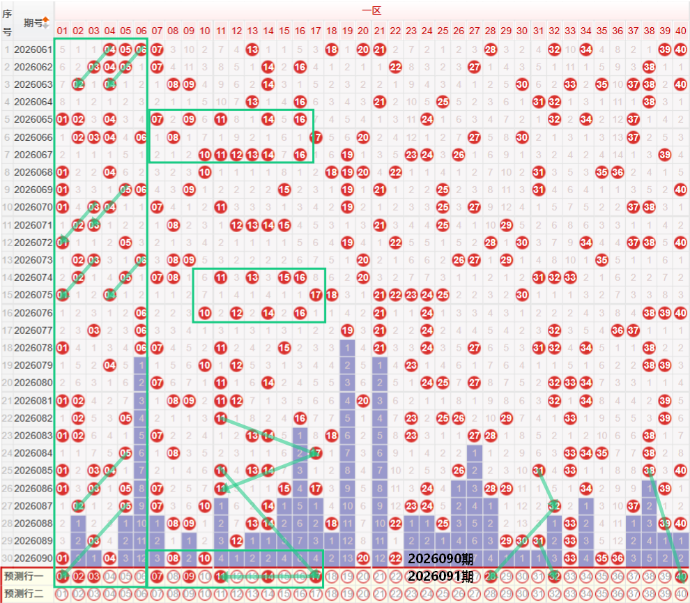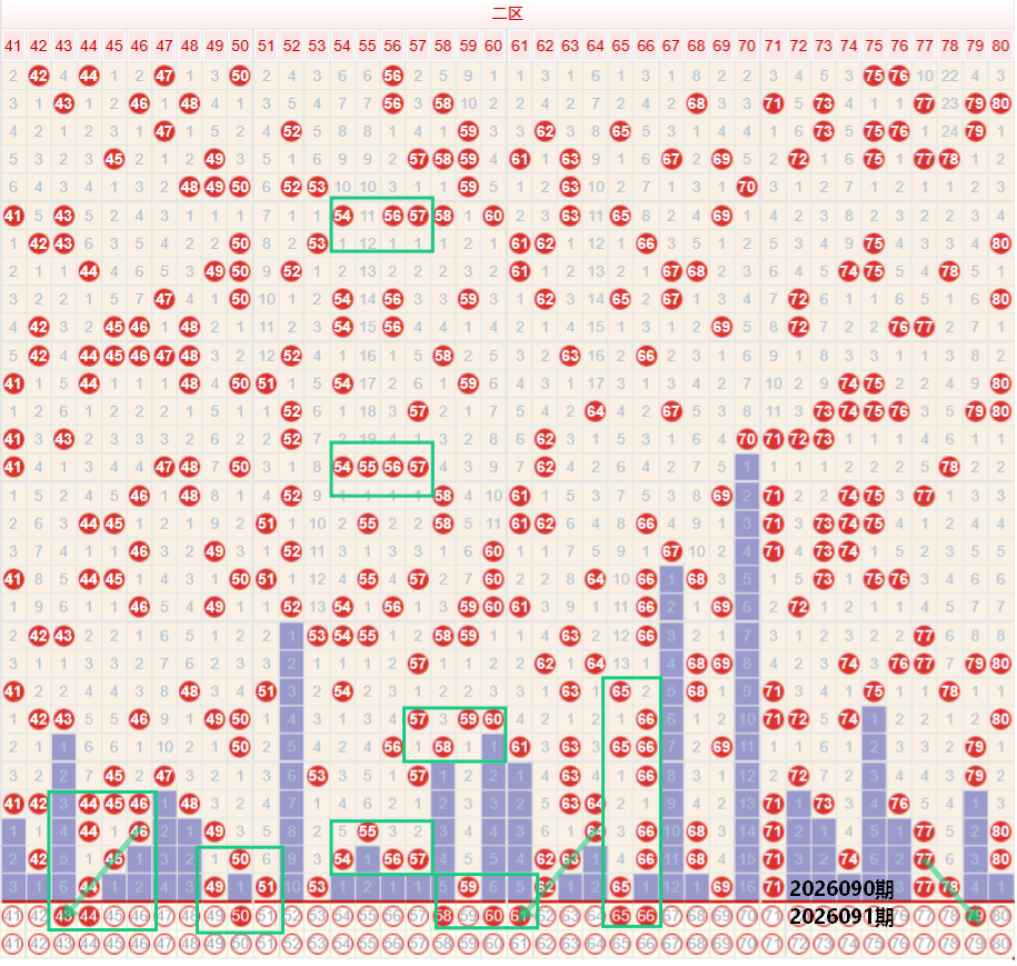 如图所示:在本期大数区的选号中注意在上期的走势中三区间开出了5枚中奖号码,落号数量保持在均值走势,目前的三区间有着不错的稳定落号数量,本期注意三区间的落号数量有着较高的概率继续保持在均值走势,上期开出了51的斜线第五期走势,以及49 51的分双边走势,前段位置开出了44的斜线第三期走势,本期注意43的第四期走势,以及43 45的分双边走势,这里要注意上期开出59的位置下方要注意可能会出现多码走势,重点形态关注假四连走势,四区上期开出了6枚中奖号码,依旧保持在区间的最高位走势,本期注意四区间的落号数量可能会出现下降走势,幅度考虑小幅度下降,在上期开出65的位置下方注意65的重号走势,以及66321走势,以及在上期开出62的重号走势之后,本期注意60的延续走势,以及60 61的夹二连走势,尾部位置注意79的斜线第三期走势。