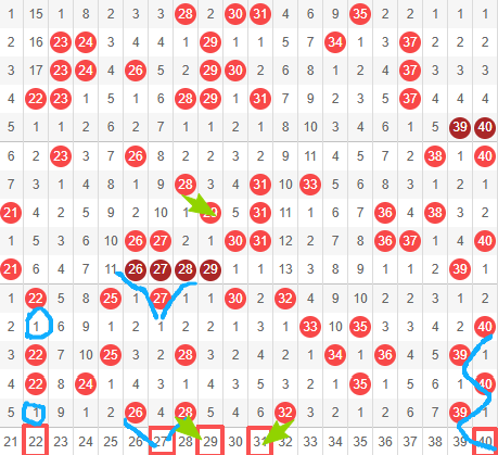 40: 如走势图,40在近15期内开出5次,每次都与39捆绑出现,上期又开出39,本期继续看好S型走势,40继续右斜连下来。